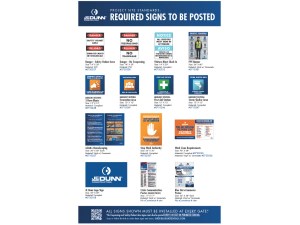 Bundles of required safety signage for all JE Dunn jobsites. These bundles include a curated set of required signs to simplify ordering, ensure consistency, and reduce the risk of missing mandatory signage. Adjust quantities from the Cart page or order additional signs individually.